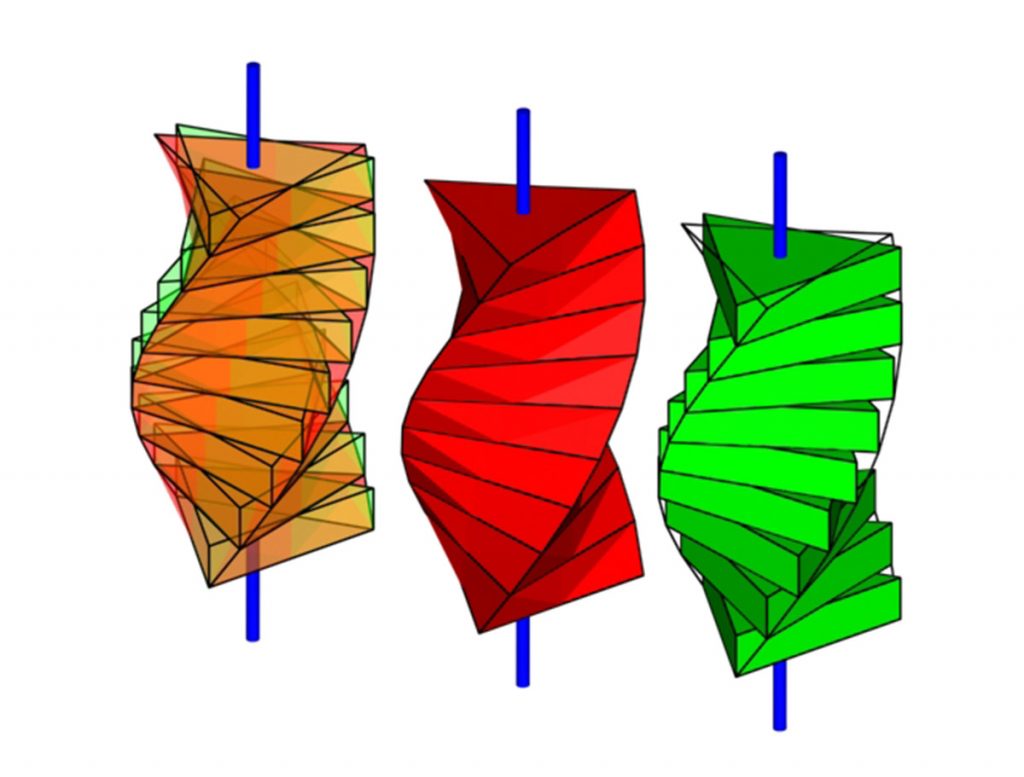 En la mitad de cada una de las imágenes se observa una torsión que invierte el eje y la información (colores o longitudes de onda) que discurre por los distintos niveles.