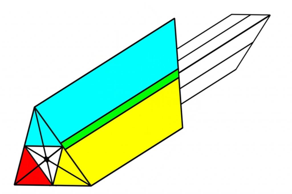 Las Fig. 1,2 y 3 son distintas perspectivas de la unidad estructural que he utilizado para construir todos los poliedros regulares empleados como modelos de estudio en este trabajo. La arista conformada como prisma triangular regular es dicha unidad estructural, común, tanto a los mencionados poliedros regulares como al complejo poliédrico regular (CPR).