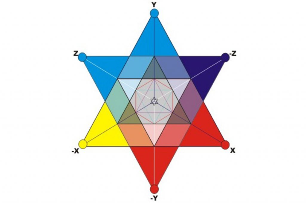 En las Fig. 1, 2 y 3, las variables representadas se corresponden con las longitudes de onda del espectro de luz visible, es decir, las longitudes de onda correspondientes con los colores primarios (rojo, amarillo y azul) y longitudes de onda correspondientes a los colores (anaranjado, verde y violeta) obtenidos por síntesis aditiva de los anteriores. El prisma blanco central se correspondería con la luz blanca. Jugamos, por tanto, con tres variables principales, tres variables conjugadas y una variable original. Igual que, en estas figuras, he utilizado como variables los colores, también podría haber utilizado como tales el largo, ancho y alto del espacio (x,y,z,) o el pasado, presente y futuro, del tiempo o la presión, volumen y temperatura, de la cinética de los gases, o lo sólido, líquido y gaseoso de los estados posibles de los materiales, etc.