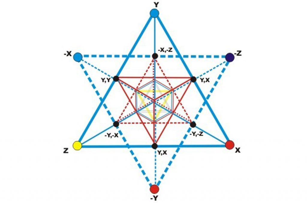 La Fig. 6, nos muestra cuatro posiciones verticales de un eje ternario de inversión. También nos muestra una vista superior y otra inferior de cada una de las posiciones del eje. Los niveles posibles de transmisión de los ejes ternarios son siete, y derivan directamente de su propia estructura: un nivel de información distinto para cada cara, un nivel de información distinto para cada una de las confluencias de cada dos caras, y un nivel central. Las líneas negras dibujadas en las imágenes se corresponden con los citados niveles de información.