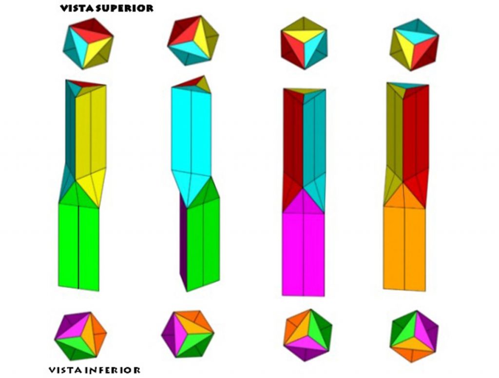 La utilización del prisma triangular regular como unidad estructural de los poliedros regulares, tal vez, se pueda justificar, además, de por la facilidad y precisión con que puede descomponerse en otros prismas triangulares regulares, por la idoneidad de este cuerpo geométrico para ser empleado como esquema en la representación de las tres variables que usualmente se repiten en el estudio de problemas de muy diversa naturaleza y que ya tendremos la oportunidad de precisar. Lo anterior, unido a la fácil observación de la conjunción y evolución de esas tres variables en el marco del espacio determinado por las formas poliédricas regulares son las razones que me han motivado a adoptar este enfoque. No quiero dejar de citar igualmente la facilidad de estudio que de los poliedros regulares convencionales biselados y de su evolución, permite esta composición estructural.